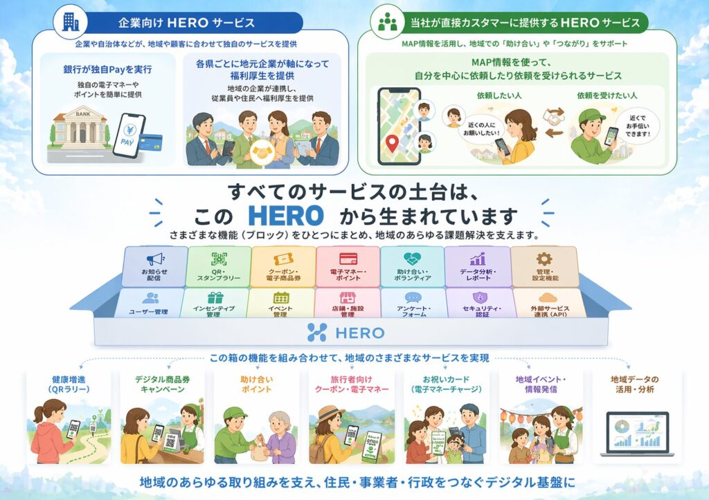 | 助け合いDX「HERO」の提供 クラウドサービスを活用した課題解決 上記に伴う関連サービスの提供とコンサルティング業務 ※「助け合いDX」は、株式会社GreatValueの登録商標です。 |